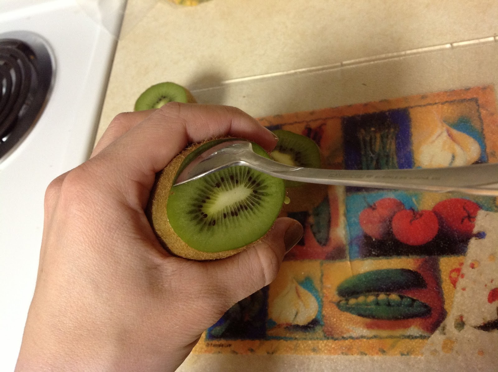Next is where it gets tricky. Slide a spoon in-between the fruit and the skin. (This picture was not easy to take!) Then slide the spoon all the way around the edge of the fruit.